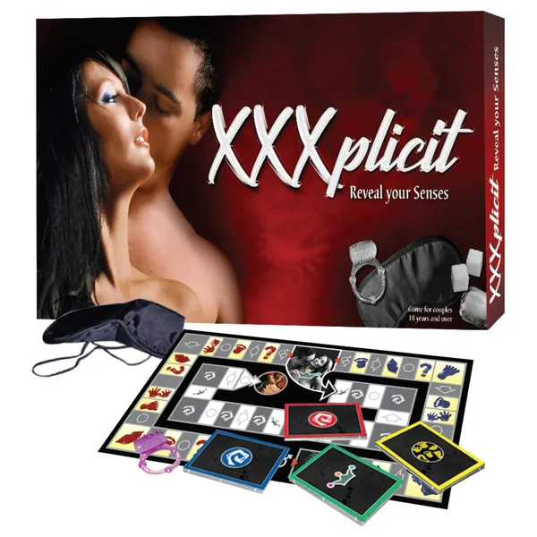 Tantalizing Accessories: XXXplicit comes with tantalizing accessories that enhance the excitement, including 2 tokens, 1 die, 1 hourglass, 1 board, 1 blindfold, 1 vibrating ring, and 4 decks of cards.