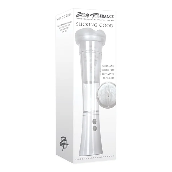 Zero Tolerance Sucking Good Masturbation device from Evolved Novelties. That is one good sucking vibrating masturbator! Experience the unique sensation of a stretchy soft sleeve inside a vacuum pump that squeezes and pulls like the real thing, with a tight Thermoplastic Elastormers TPE chamber textured for extra pleasure. Choose from three speeds of vacuum suction, or opt for the special feature that sucks and releases alternately for an incredible fantasy fulfilling sequence, all the while humming along with a 9 speed vibrating base. Use the silicone sleeve to turn your vacuum toy into a penis pump to build length and girth and even keep track with measurements along the side. All parts of this toy fully dissemble for cleaning with Zero Tolerance Masturbator Cleaner and a warm water rinse, and get a head start on your fun with a adult movie DVD download and free foil pack of lube! 2 sleeves to choose from masturbator and pump styles. Tight vaginal channel with ringed TPE masturbator sleeve. Silicone sleeve to use as penis pump. Stroker sleeve made from soft and stretchy TPE. Silicone sleeve made from medical grade silicone. 3 sucking vacuum speeds 1 sucking function that sucks, then releases at intervals . Vibrating base adds intense sensations. 9 vibrating speeds and functions at base. Opening at end of stroker for easy cleaning. Stroker chamber can be fully removed to wash. Stroker chamber has measurements for tracking length increase. LED lights illuminate buttons when in use. Height: 13.5 inches, depth 3.72 inches, width 3.72 inches. Comes with DVD download code. Comes with ZT Jack Aide lube foil pack. Magnetic rechargeable, USB cable included. Splash proof, not waterproof or submersible. 5 years warranty from Zero Tolerance Toys..